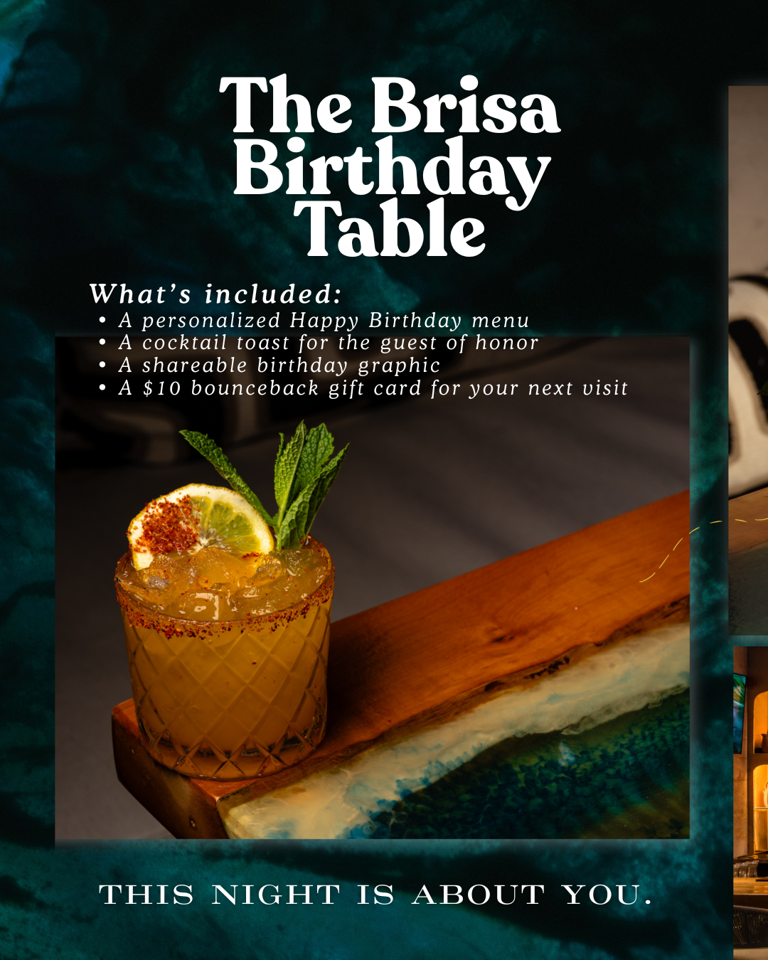 - One complimentary signature cocktail for the birthday guest of honor