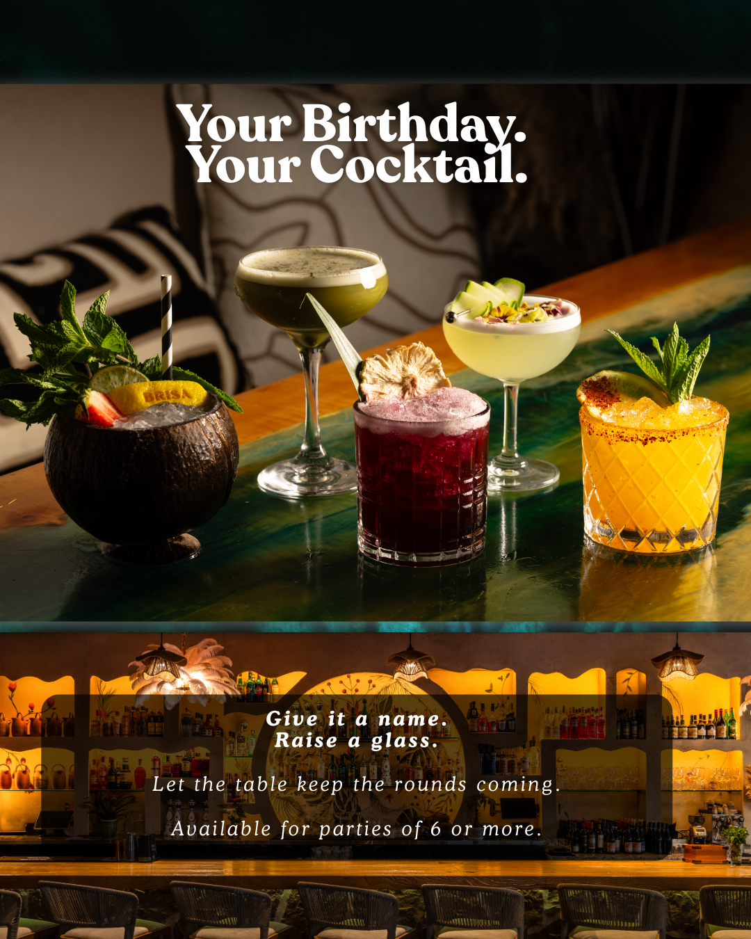 With Create Your Cocktail, the birthday guest works with a Brisa bartender to dream up a signature drink for the night. Give it a name, raise a glass, and watch the table order round after round.